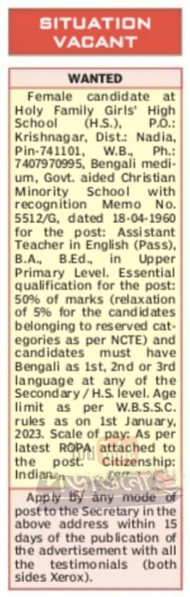 Holy Family Girls High (H.S.). P.0.: Krishnagar, Dist: Nadia, Pin-741101, W.B., Ph.: 7407970995, Bengali medi um, Govt. aided Christian Minority School with recognition Memo NO. 5512/G, dated 18-04-1960 for the post: Assistant Teacher in English (Pass), B.A B.Ed in Upper Primary or the post: Essential qualification 50% of marks (relaxation of 5% for the candidates belonging to res erved cat egories as NCTE) and candidates must have Bengali as 1st, 2nd or 3rd language at any of the Second ary/H.S. level. Age limit as per W.B.S.S.C. rules as on ist January, 2023. Scale of pay: As per latest ROPA attached to the post. Citizenship:
