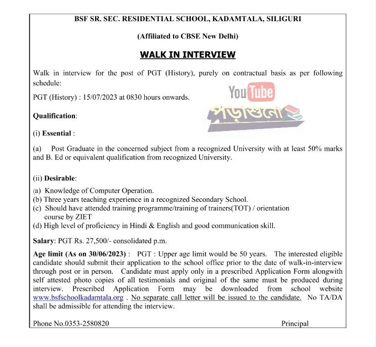 পিজিটি (ইতিহাস) পদের জন্য কোনো রকম রিটেন এক্সাম হবে না । কেবল ইন্টারভিউ মাধ্যমে শিক্ষক নিয়োগ করা হবে । আর হ্যা বন্ধুরা পোস্ট টি সম্পূর্ণরূপে চুক্তিভিত্তিক ।