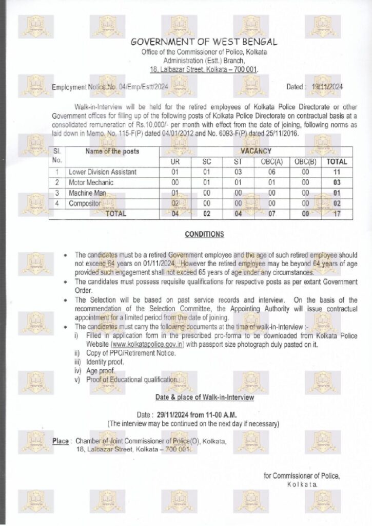 কলকাতা পুলিশ ডিরেক্টরেট, 18 লালবাজার স্ট্রিট, কলকাতা, চুক্তিভিত্তিক বিভিন্ন পদে অবসরপ্রাপ্ত সরকারি কর্মচারীদের নিয়োগের জন্য ওয়াক-ইন সাক্ষাৎকার এর আয়োজন করেছে।