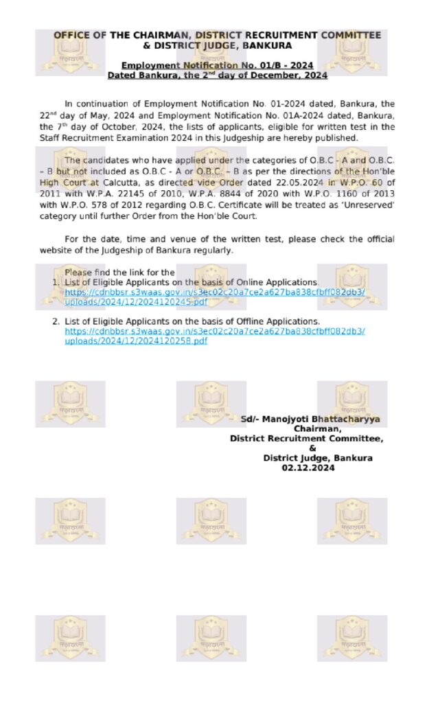বাঁকুড়া জেলার জজ সাহেব এবং জেলা নিয়োগ কমিটির চেয়ারম্যানের তরফ থেকে গুরুত্বপূর্ণ বিজ্ঞপ্তি প্রকাশিত হয়েছে। স্টাফ রিক্রুটমেন্ট পরীক্ষা ২০২৪ এর লিখিত পরীক্ষার জন্য যোগ্য প্রার্থীদের তালিকা প্রকাশ করা হয়েছে।
