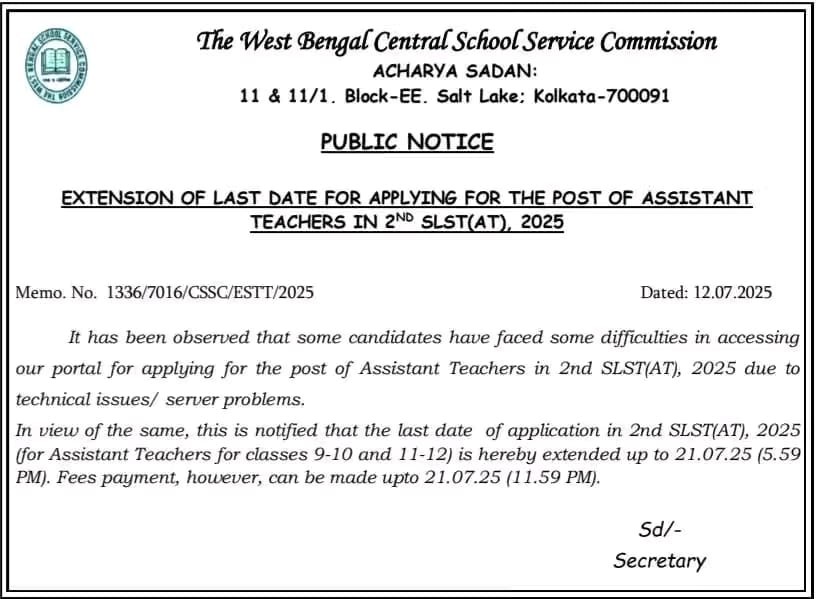 📅 অনেক প্রার্থী টেকনিক্যাল সমস্যার কারণে অনলাইনে আবেদন করতে পারেননি। সেই কারণেই 2nd SLST (AT), 2025-এর (ক্লাস 9-10 ও 11-12) আবেদন করার শেষ তারিখ বাড়িয়ে ২১.০৭.২৫ (সন্ধ্যা ৫:৫৯টা) পর্যন্ত করা হয়েছে।