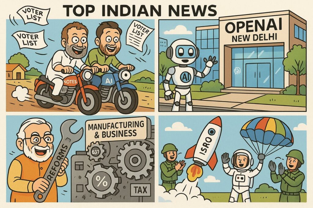 - Politics: Rahul Gandhi and Tejashwi Yadav ride bikes in Bihar’s Purnia during ‘Voter Adhikar Yatra’ highlighting voter roll irregularities. 🚴♂️