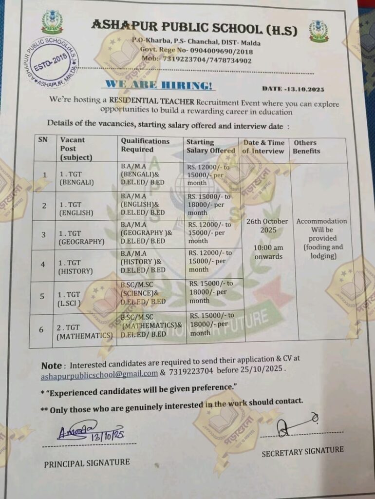 শিক্ষাক্ষেত্রে ক্যারিয়ার গড়তে চান? তাহলে এই সুযোগ হাতছাড়া করবেন না! মালদা জেলার অন্যতম স্বনামধন্য প্রতিষ্ঠান আশাপুর পাবলিক স্কুল (H.S) প্রকাশ করেছে রেসিডেনশিয়াল শিক্ষক নিয়োগের বিজ্ঞপ্তি। যারা শিক্ষাদানে দক্ষ এবং শিক্ষার্থীদের ভবিষ্যৎ গড়তে আগ্রহী, তাদের জন্য এটি একটি অসাধারণ সুযোগ।