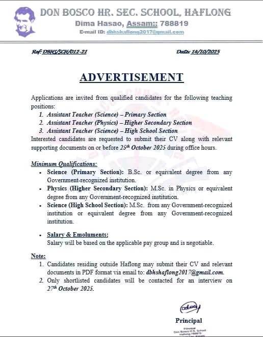 📰 DON BOSCO HR. SEC. SCHOOL, HAFLONG – শিক্ষক নিয়োগ বিজ্ঞপ্তি ২০২৫ | শিক্ষাক্ষেত্রে গৌরবময় সুযোগ 🌟