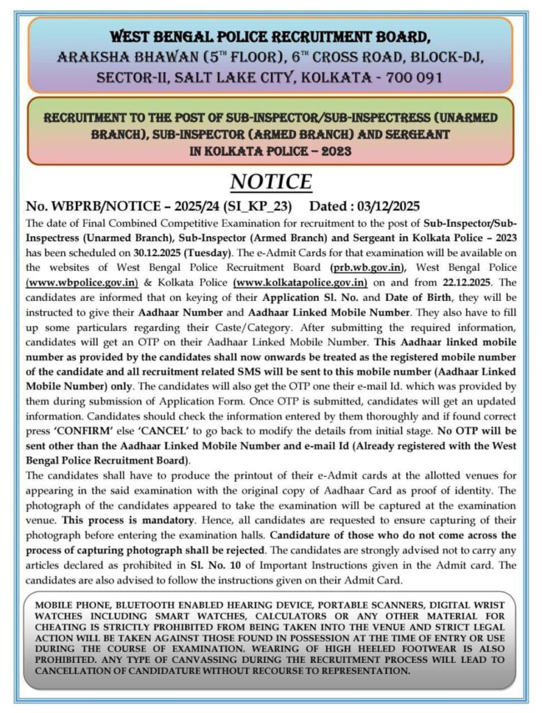 📢 এক নজরে বড় আপডেট: Kolkata Police Constable 2024 + SI Final Exam 2023