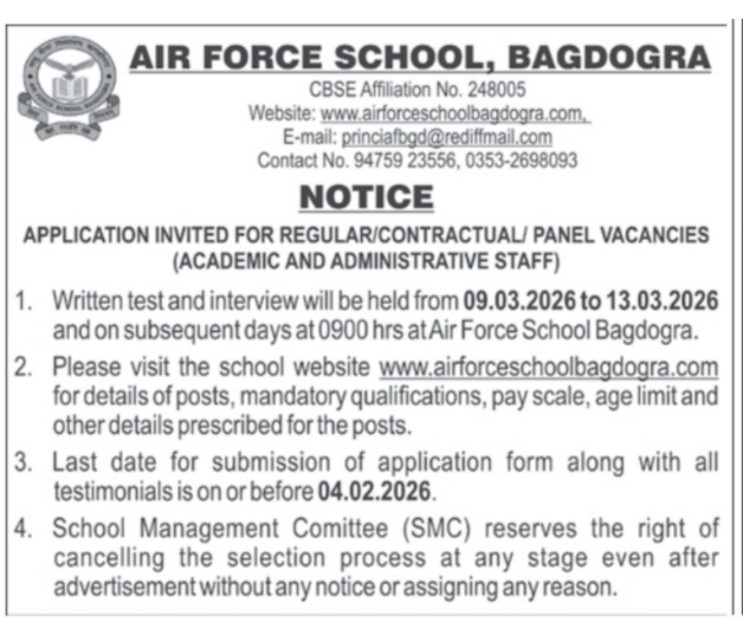 Air Force School Bagdogra-এর পক্ষ থেকে ২০২৬ সালের জন্য একটি গুরুত্বপূর্ণ নিয়োগ বিজ্ঞপ্তি প্রকাশ করা হয়েছে।