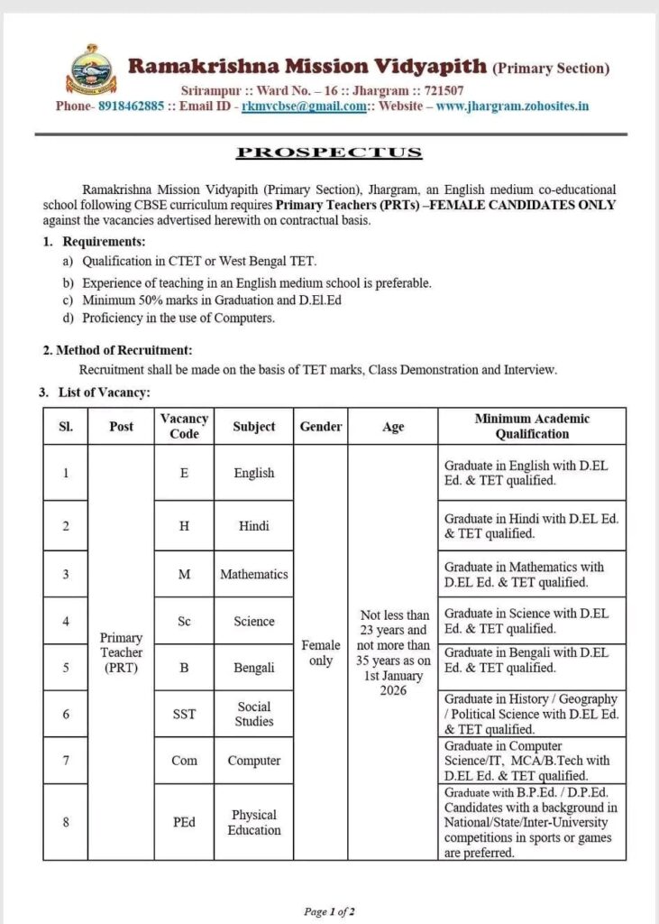 পশ্চিমবঙ্গের ঝাড়গ্রাম জেলায় অবস্থিত Ramakrishna Mission Vidyapith (Primary Section) থেকে Primary Teacher (PRT) পদে শিক্ষক নিয়োগের জন্য অফিসিয়াল বিজ্ঞপ্তি প্রকাশিত হয়েছে। এই স্কুলটি CBSE Curriculum অনুসরণকারী একটি English Medium Co-Educational School। নিয়োগটি সম্পূর্ণভাবে Contractual Basis-এ করা হবে এবং শুধুমাত্র Female Candidates আবেদন করতে পারবেন।